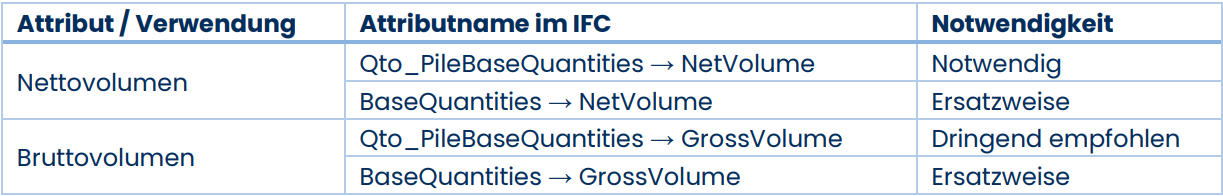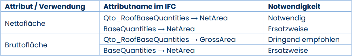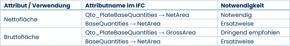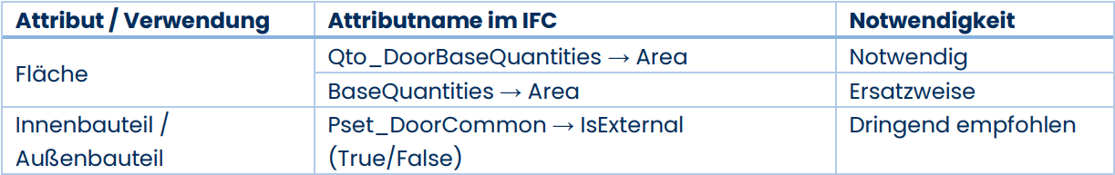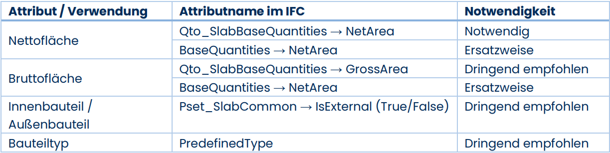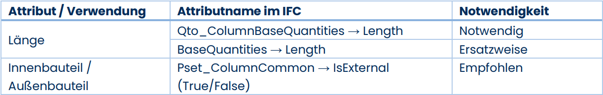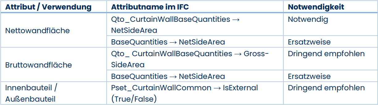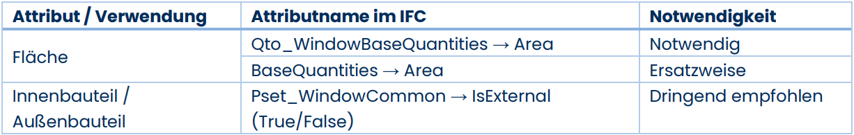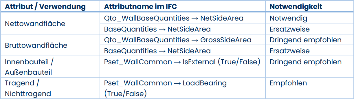 Im Folgenden werden die verwendeten Eigenschaften der jeweiligen IFC-Gebäudeelemente aufgeführt. Dabei sind die Eigenschaften in verschiedene Notwendigkeitsstufen klassifiziert: