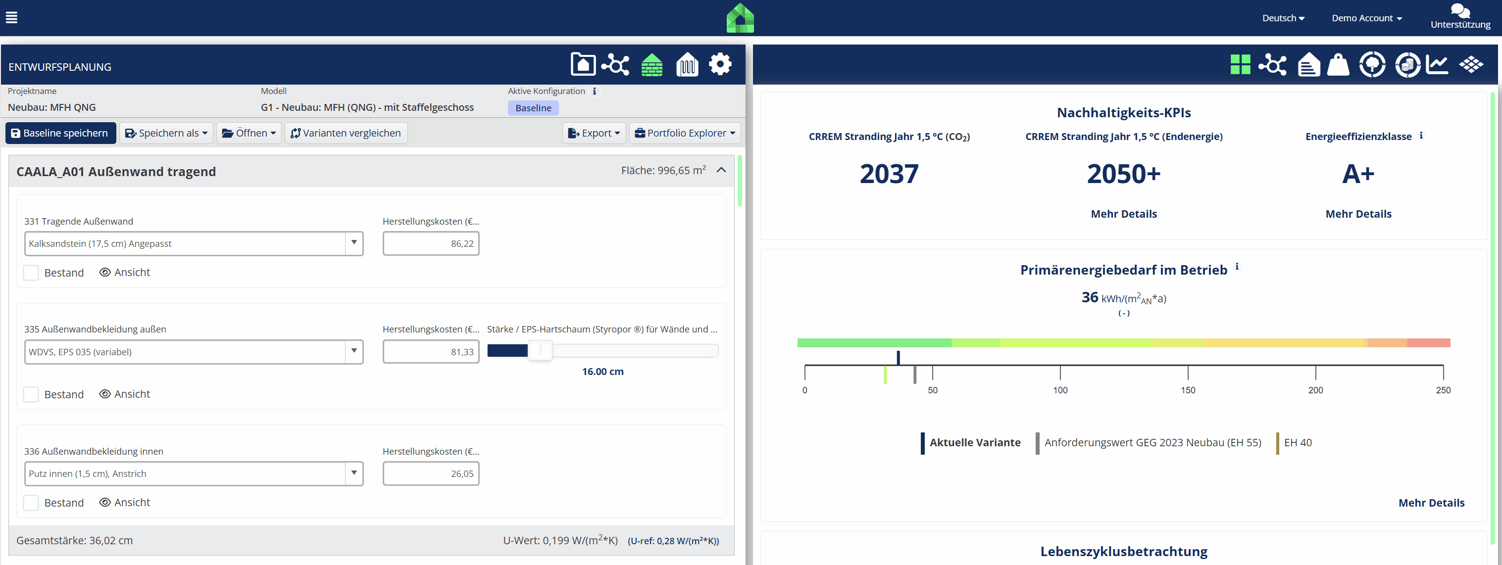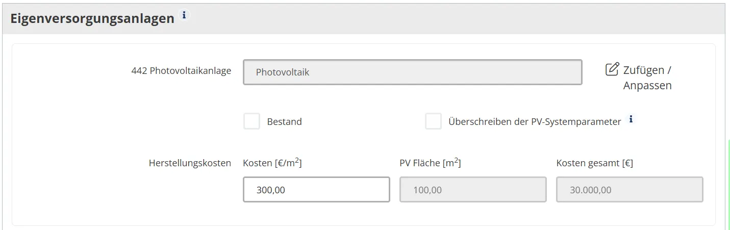 - Kosten für Technische Anlagen (Heizung, Lüftung, Beleuchtung, PV, Batteriespeicher) werden nun relativ pro Einheit (m², kWh, etc.) eingegeben.